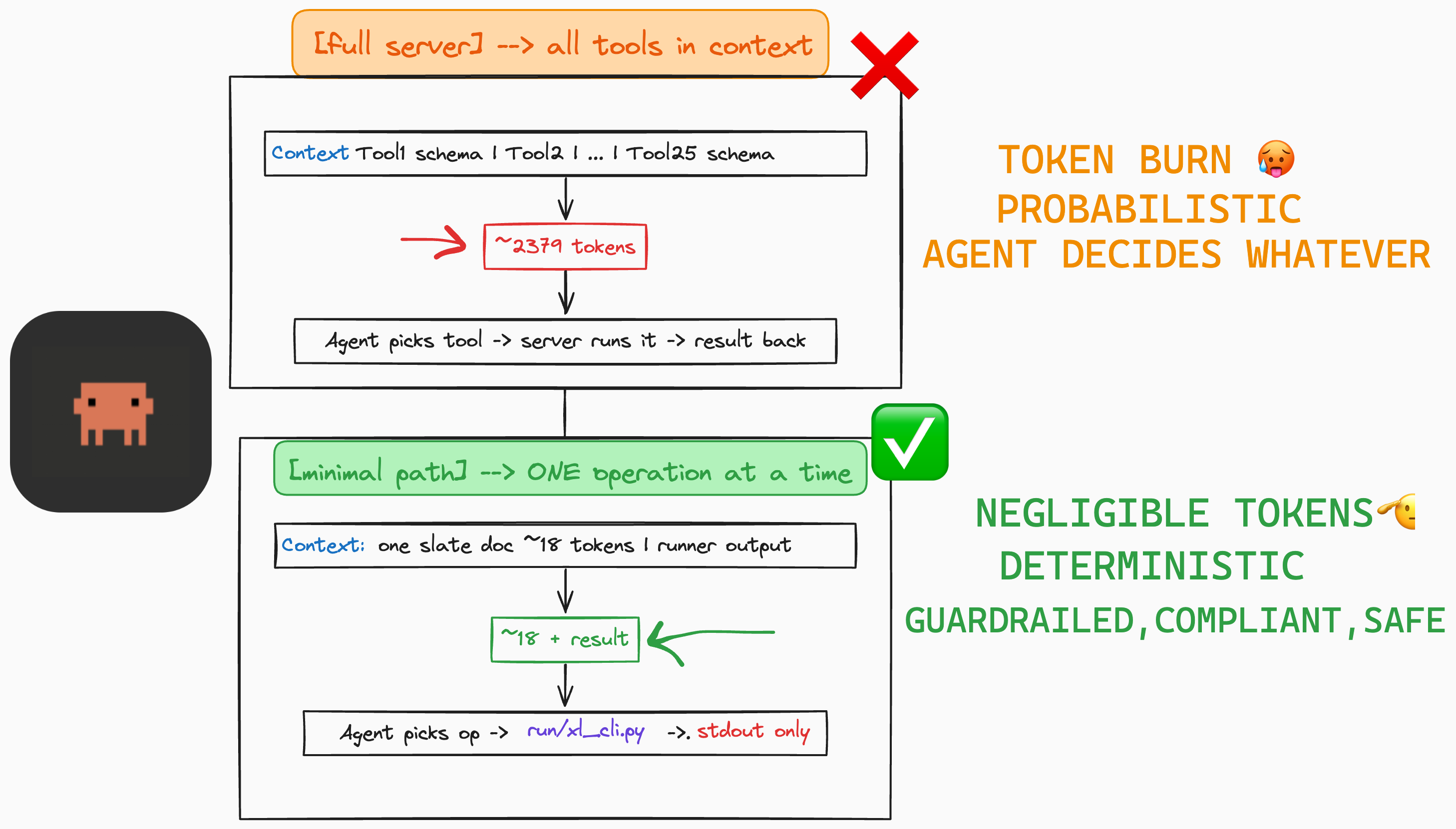 - Two ways to run: full server (stdio/SSE/HTTP) with all tool schemas in context, or the minimal path (slate docs plus